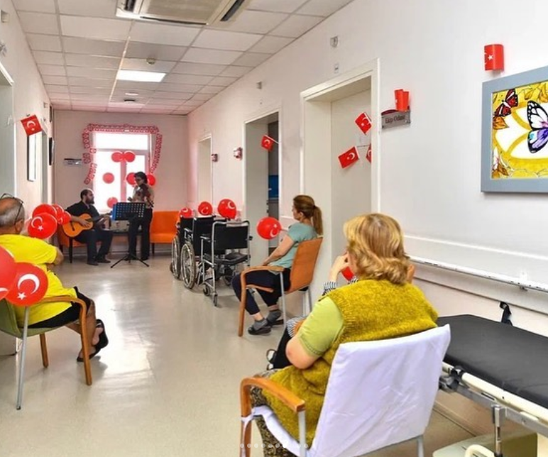2 katlı Palyatif Servisinde hastalarımız ve dışarı çıkıp 29 Ekim coşkusunu yaşayamayacak refakatçileri için tüm koridorları bayraklarla,balonlarla süsledik.